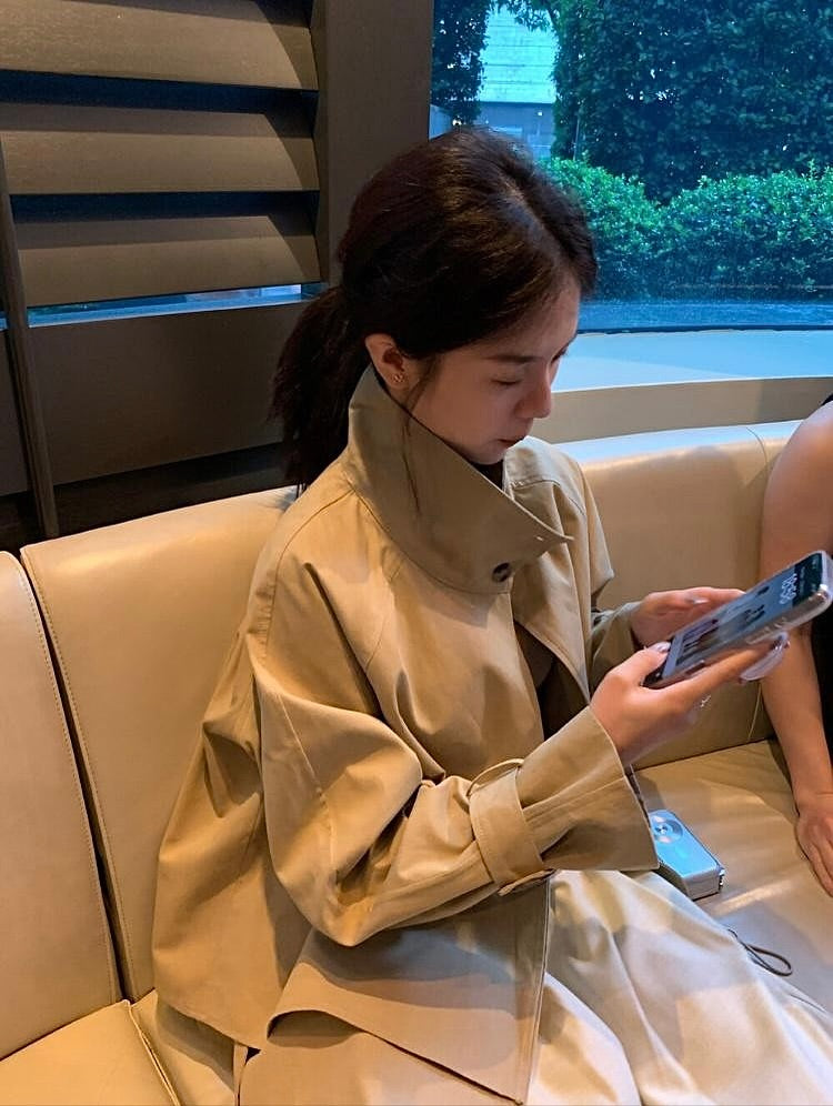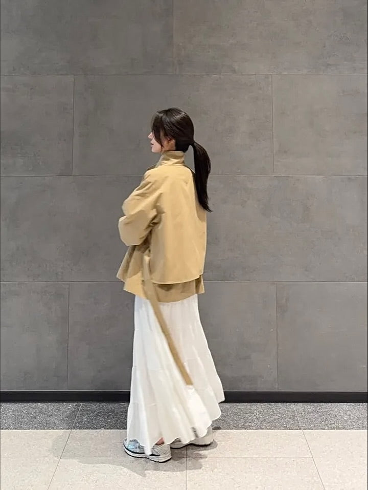 This trench jacket is made from a sturdy cotton blend that holds its shape without looking slouchy. The high-neck design adds a chic touch, and the back slit with button detail makes the back view just as stylish. You can cinch the waist with the strap to create the silhouette you like. Available in two elegant shades—a classic deep beige and a refined light beig