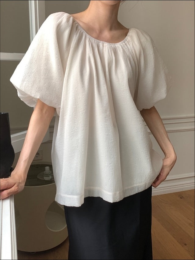 This blouse has a relaxed fit that falls neatly to the hip with a lovely neckline that gently reveals the shoulder line without feeling too exposed. Made from a premium organza fabric with voluminous puff sleeves, it naturally flatters the arms and gives a soft, feminine silhouette that suits all body types. It also comes with a lining, so even the ivory color isn’t see-through.