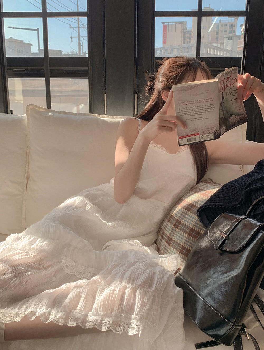A lovely dress that can be worn on its own or layered. The v-neckline with delicate lace adds a soft, feminine touch.Adjustable shoulder straps allow you to customise the length for a better fit. The long, flowy tiered silhouette falls to the ankles, offering comfortable coverage with a playful feel. Easy to style with cardigans, knits, or t-shirts,