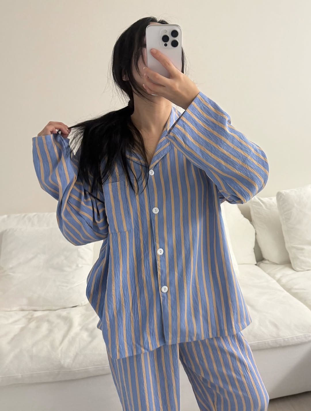 Soft fabric and calm colours make it easy and comfortable to wear and perfect for all day at home. Striped homewear with a lovely colour combination and a relaxed fit. Simple, clean design with a flattering sil