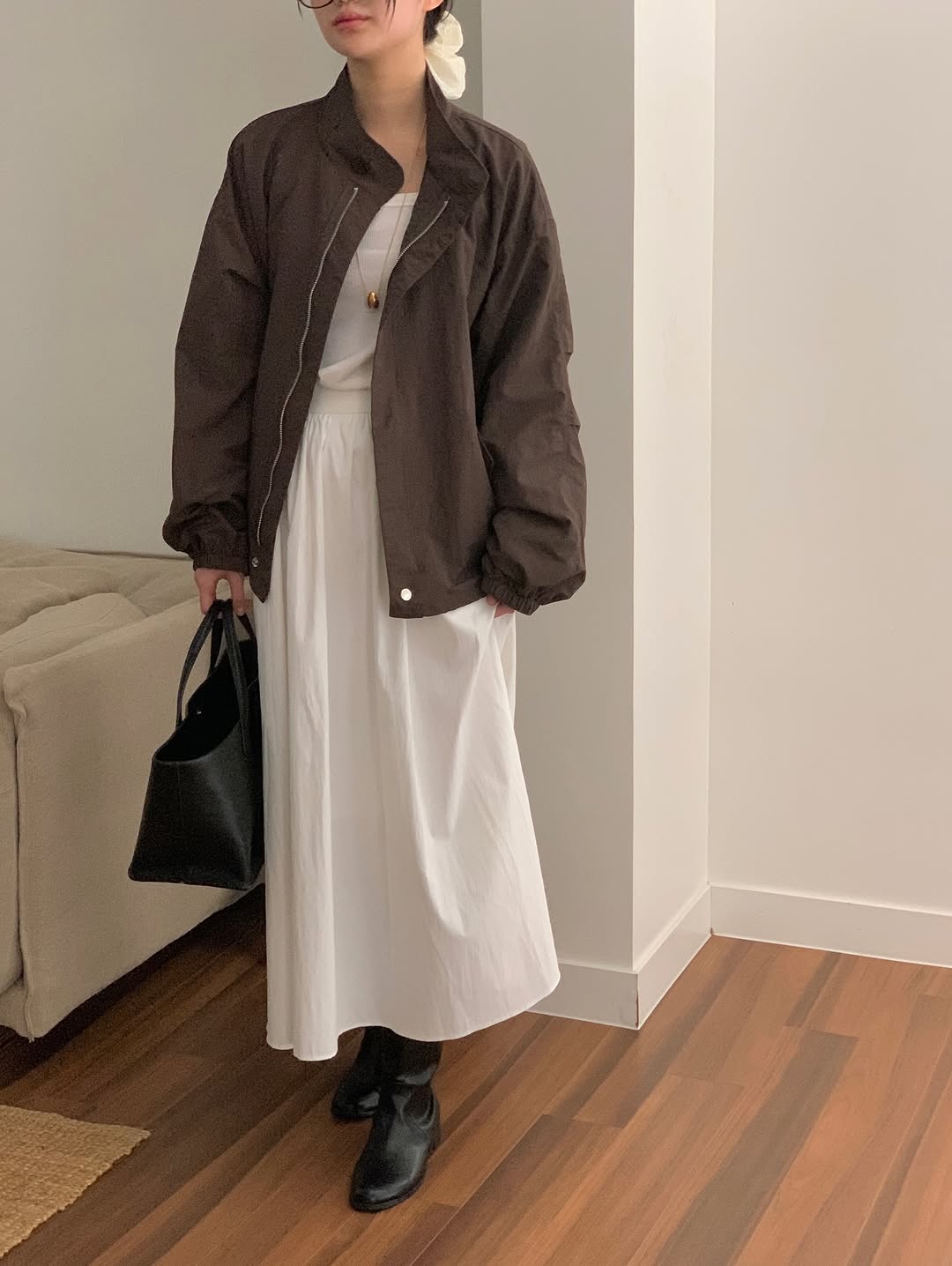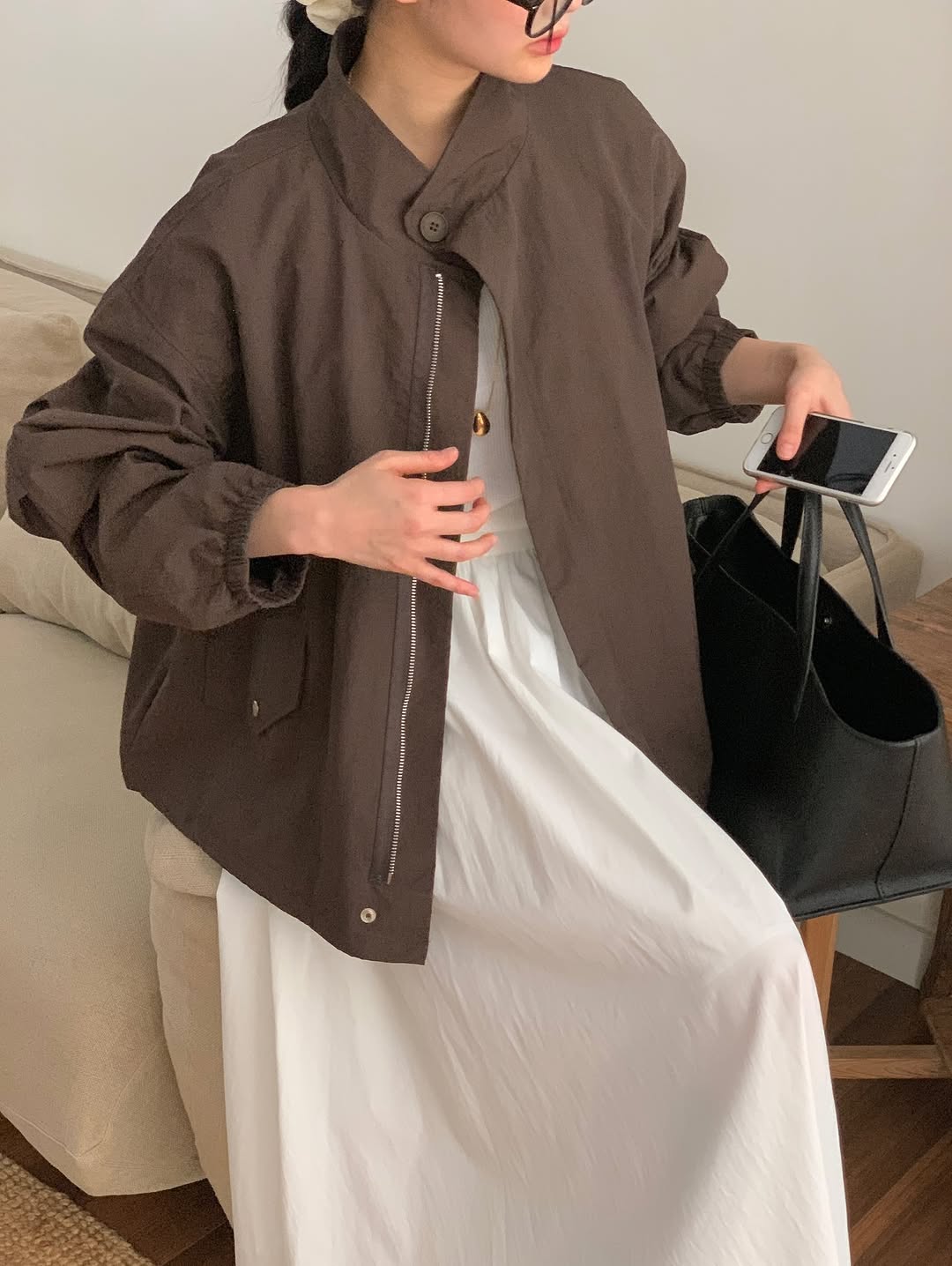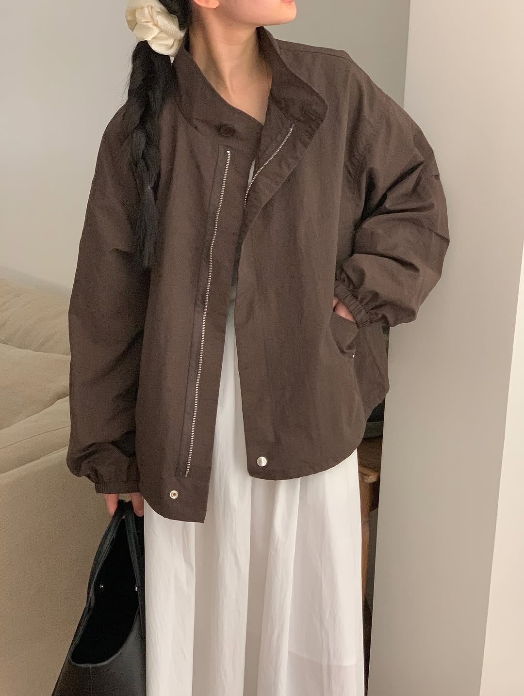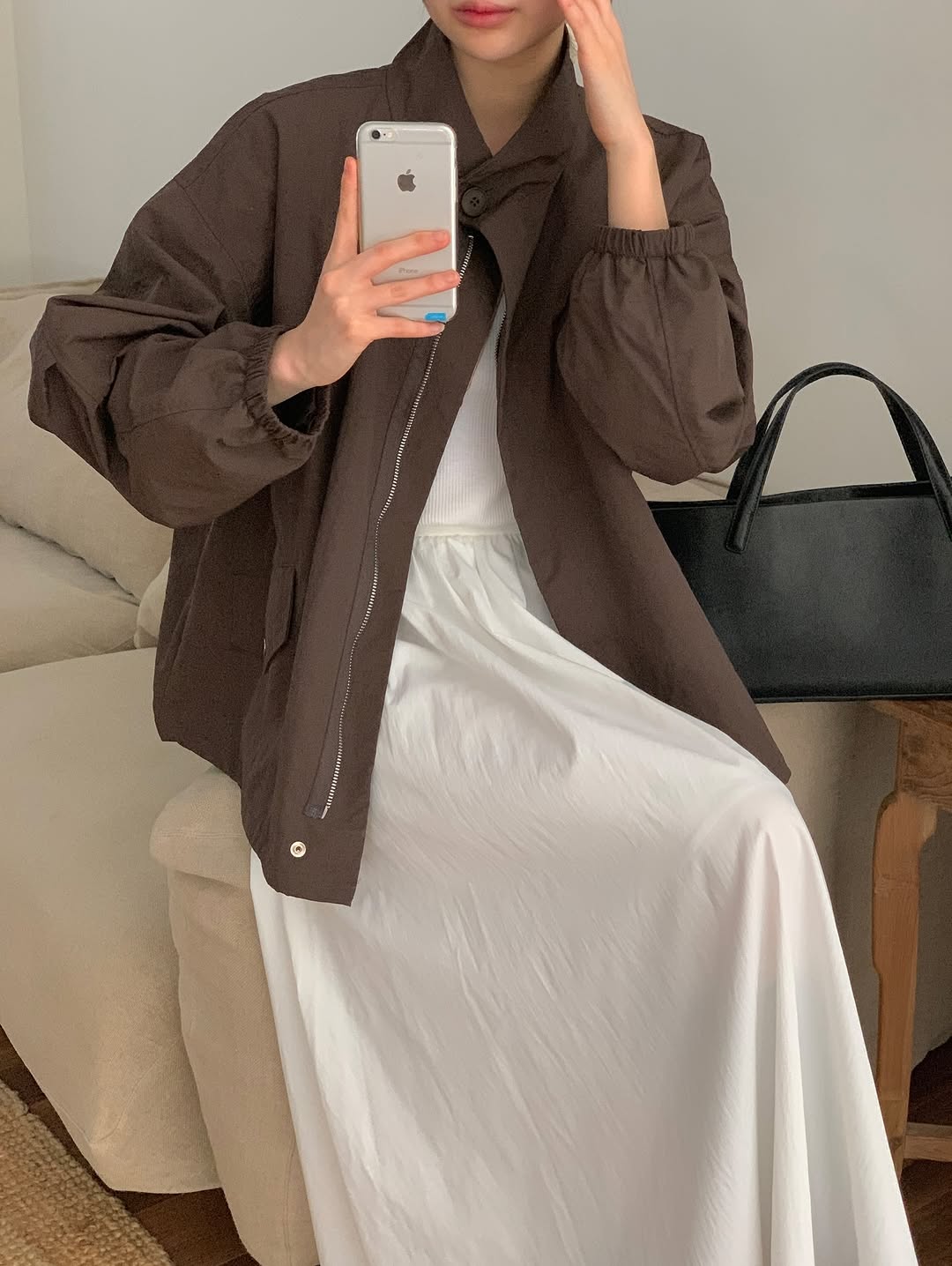 With a relaxed semi-oversized fit, it offers comfort and a natural silhouette. Pin-tuck sleeves and an adjustable drawstring hem add shape and versatility, while elastic cuffs and double zip + button closure keep it practical. Finished with clean nickel details and slanted pockets for an effortlessly stylish look.
