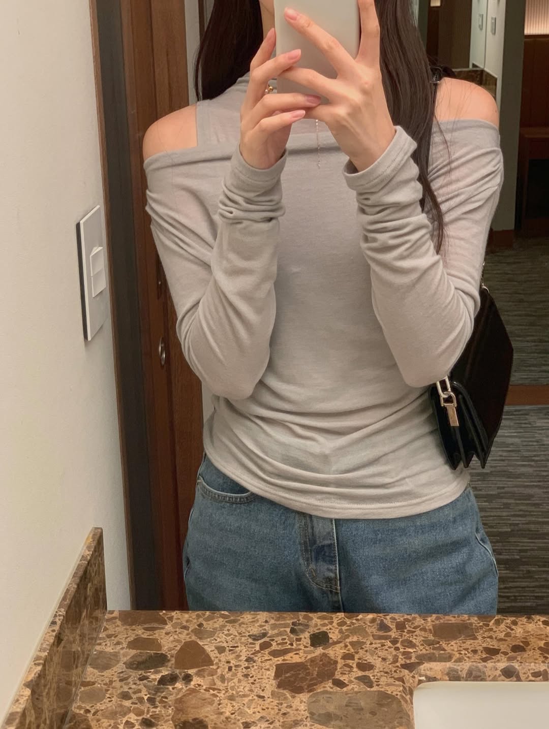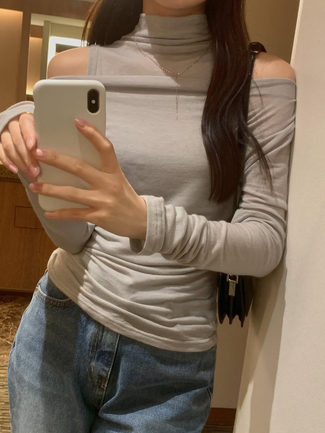 A soft, feminine mock-neck off-shoulder design that shows just the right amount of shoulder. Flattering layered style with gentle shirring on the sleeves to cover and shape beautifully — chic, comfortable, and already a bestseller.