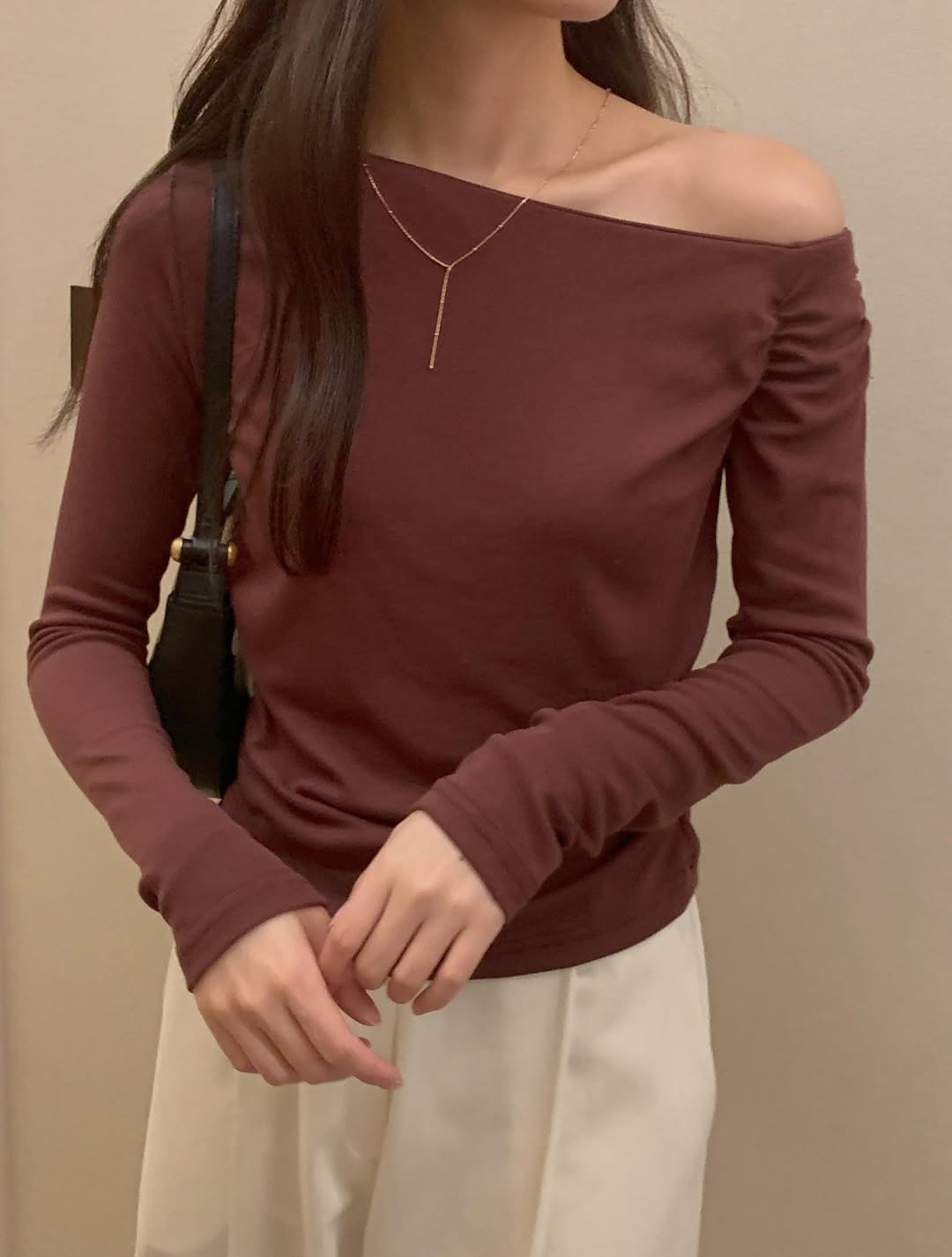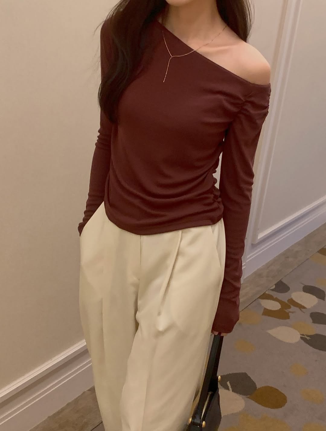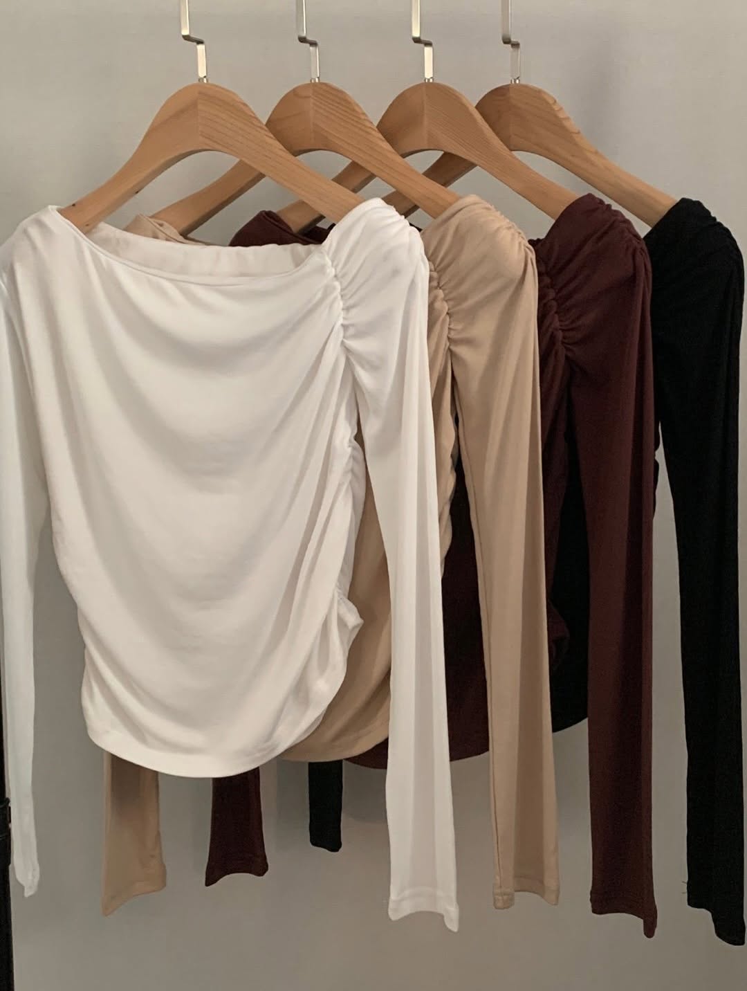 Soft and feminine for new season. This asymmetrical tee features a one-shoulder off-shoulder design — perfect even if you’re new to the style. Detailed banded shirring at the shoulder and waist adds shape, while the stretchy fabric keeps it effortlessly comfortable.