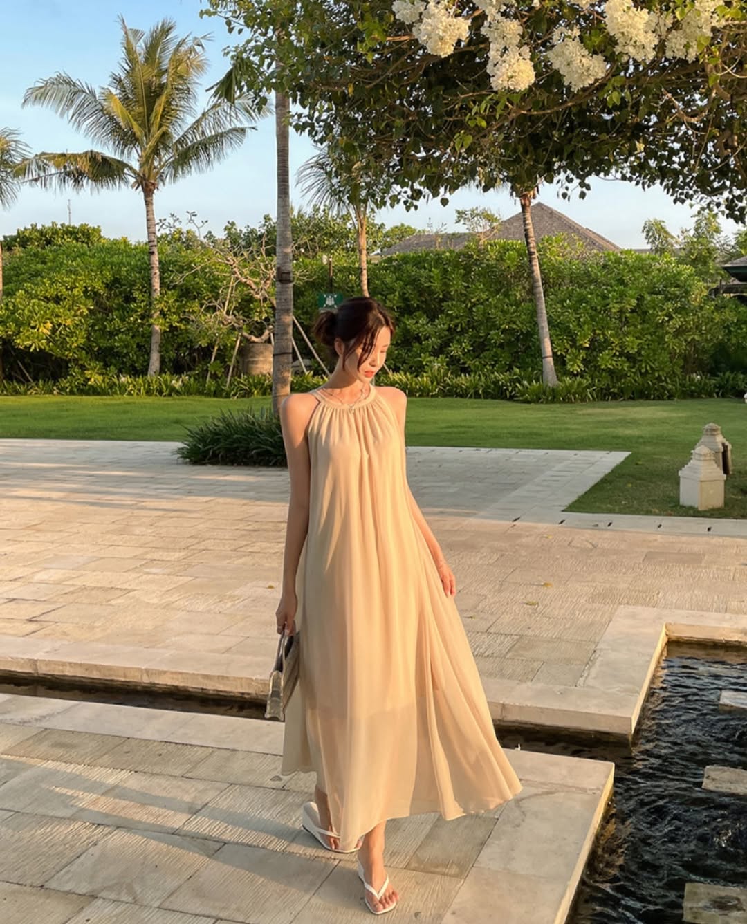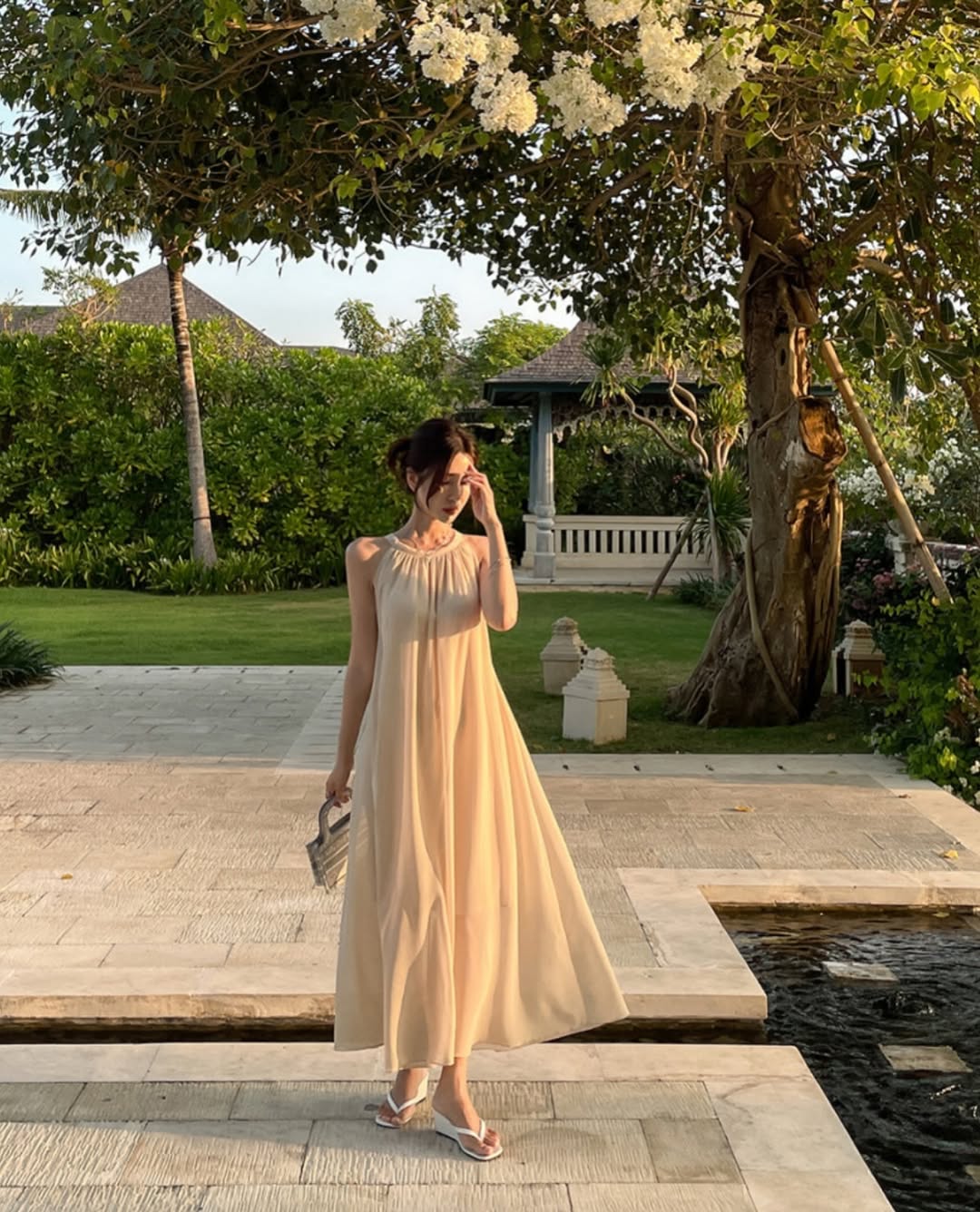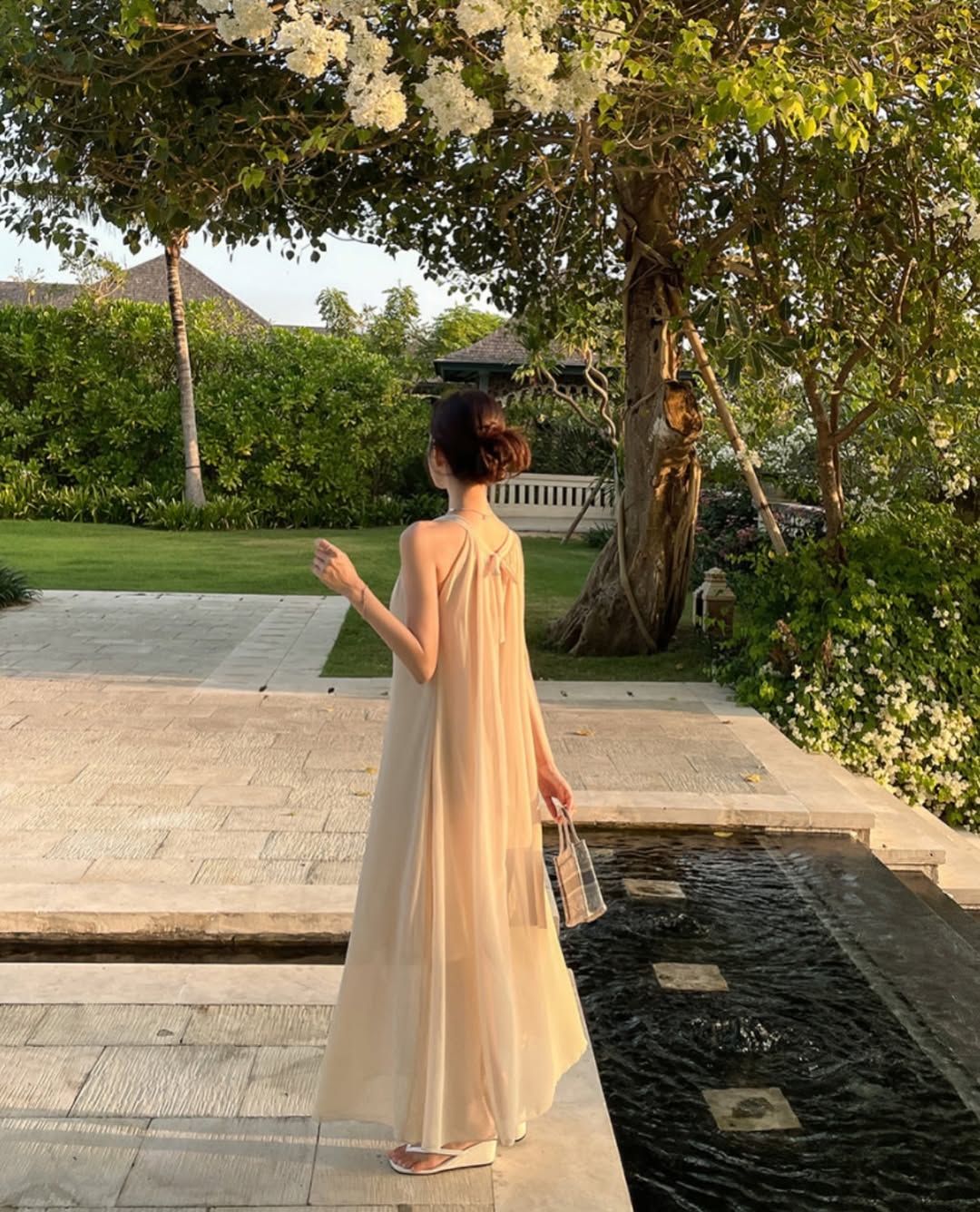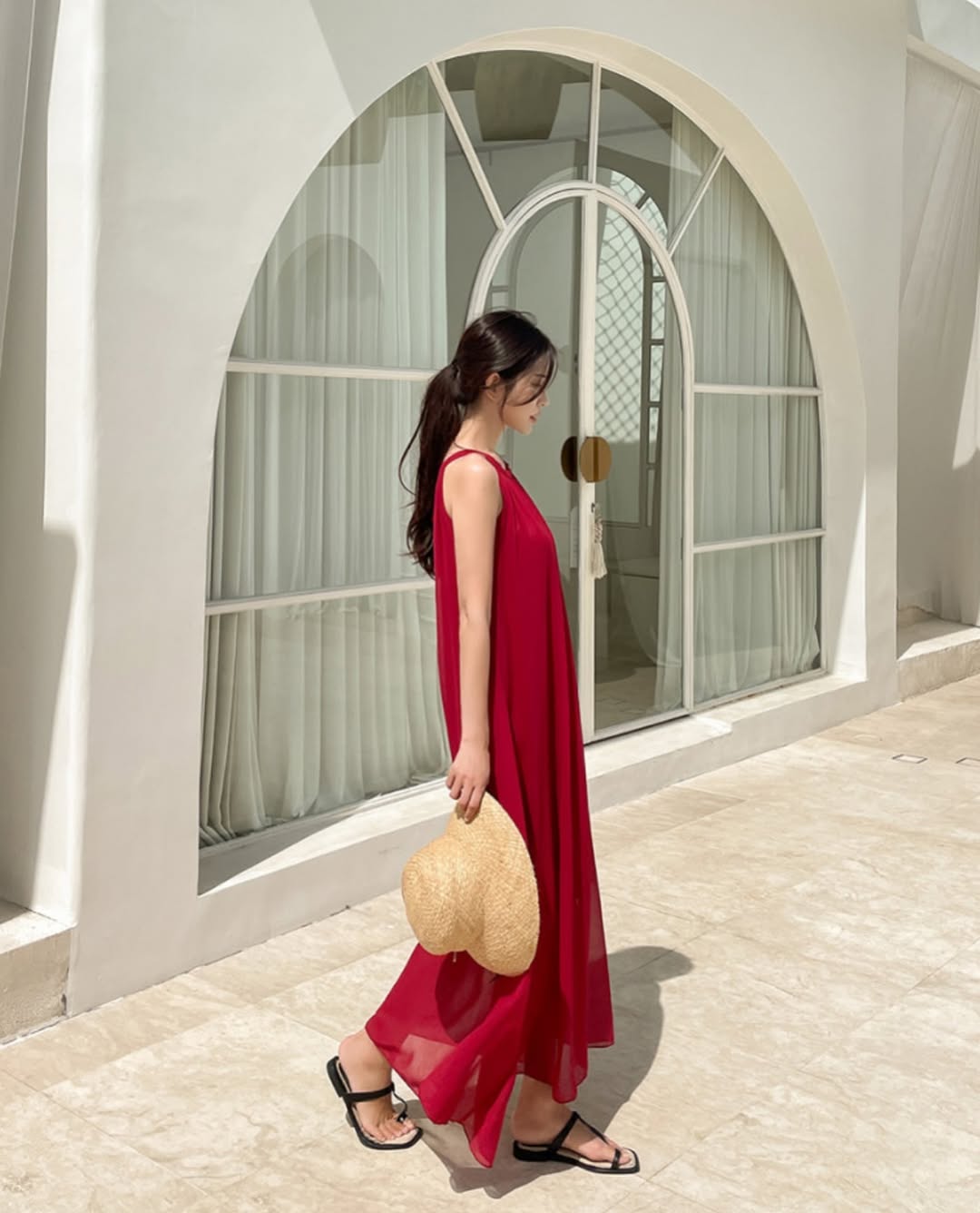 This dress is made from a lightweight chiffon fabric that flows beautifully, whether you’re walking or caught in the breeze. It comes with a matching chiffon belt, which you can use to define the waist for a more feminine look. Alternatively, wear it without the belt for a natural, relaxed flare silhouette. Highly recommended for its versatility and elegance!
