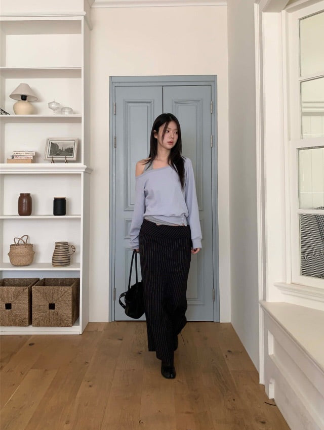 The sweatshirt features a wide neckline that can be styled slightly off-shoulder, adding a soft feminine touch.