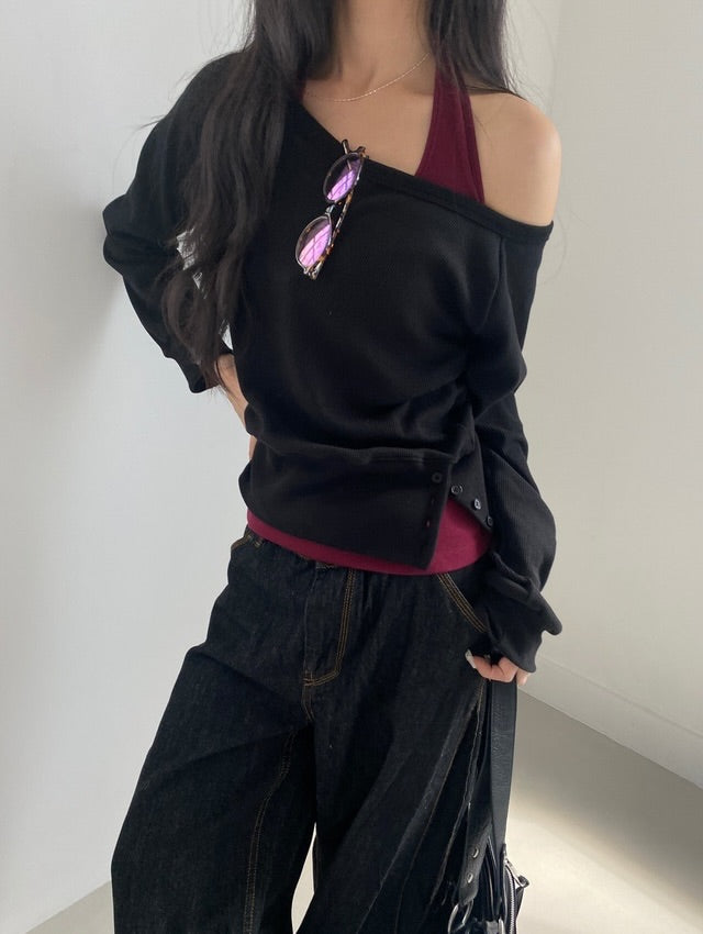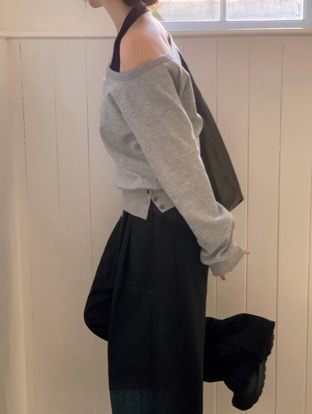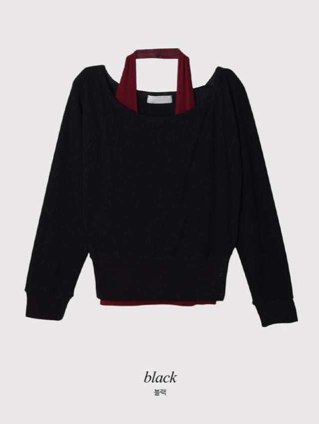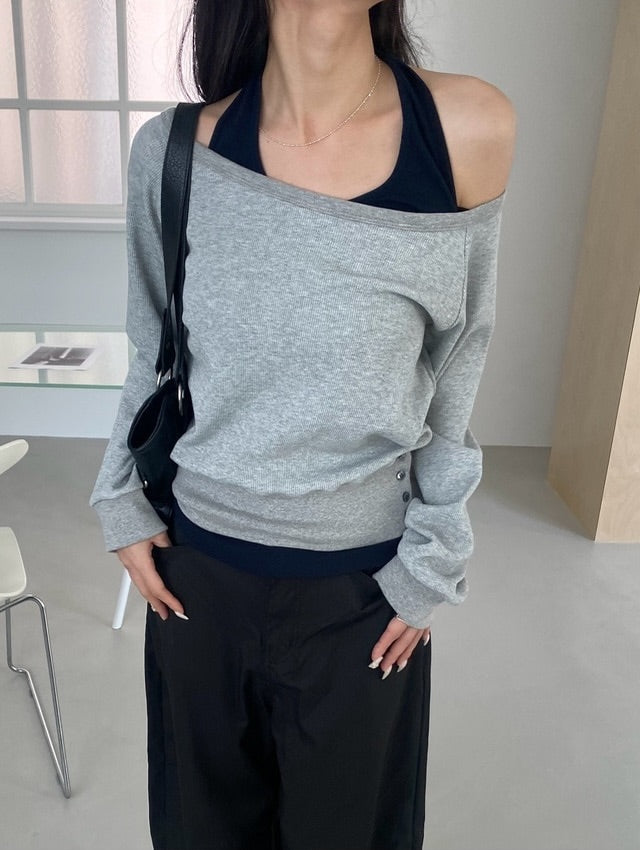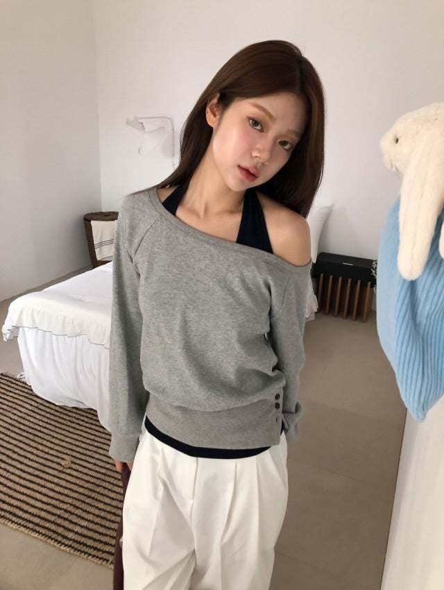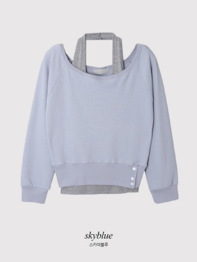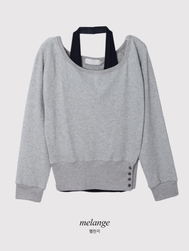 Side buttons at the hem create a subtle detail and allow you to adjust the fit. The smooth halter sleeveless top works perfectly on its own or layered with the sweatshirt.